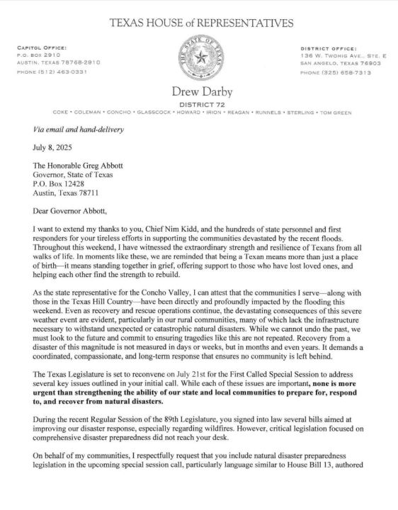 “We’re going to start a special session two Mondays from now. A special session that will have at the top of its agenda helping communities like in Kerr County, Kendall County, as well as in Central Texas and the Big Country — all areas affected by the floods of the past week — those issues are going to be on the agenda for the state to address, from top to bottom. We want to make sure that when we end that session, we end it making sure these communities are better, more resilient and have the resources that they need for the next chapter of their lives.”