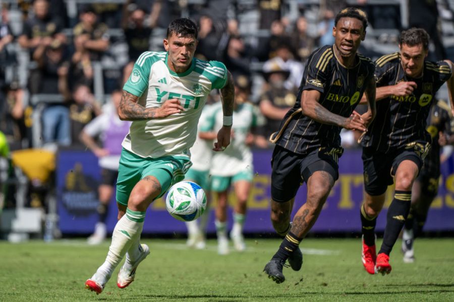 LOS ANGELES, CA – MARCH 15: Brandon Vázquez #9 of Austin FC during the seccond half of the match against Los Angeles FC at BMO Stadium on March 15, 2025 in Los Angeles, California. Austin FC won the match 1-0 (Photo by Shaun Clark/Getty Images)