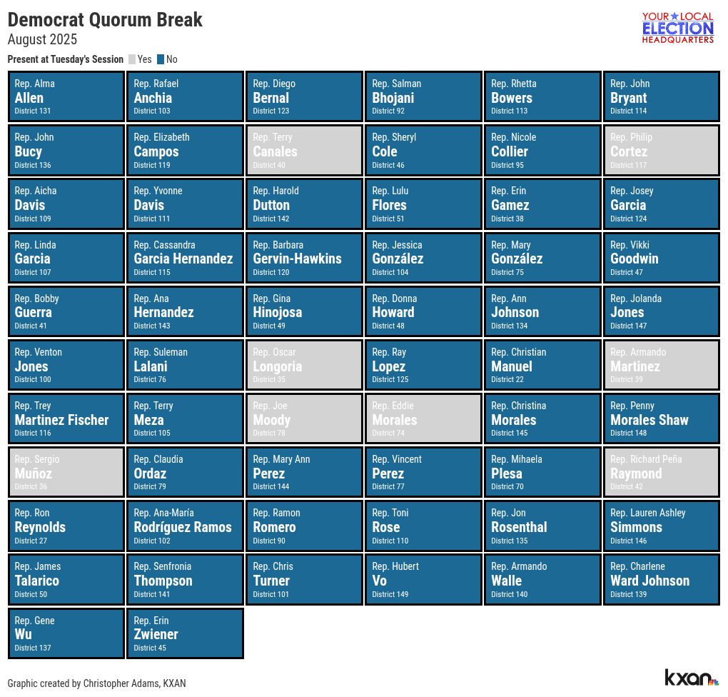 As of Tuesday afternoon’s session of the House, 54 Democrats were not present in the chamber, enough to prevent the legislature from reaching the two-thirds quorum needed to take up any items and vote. The proposed congressional maps are drawn to give Republicans up to a five seat gain.