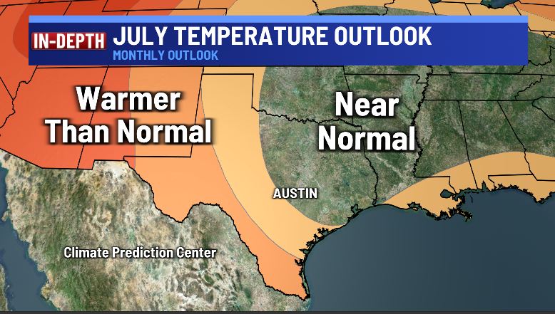 According to the latest monthly outlook from the Climate Prediction Center, our second hottest month is looking near normal if not leaning slightly hotter than normal, especially southwest of Austin.