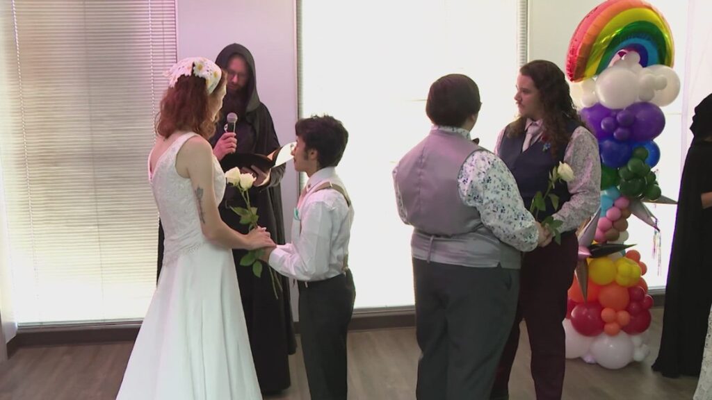 Inside the Montrose Center, a hub for the LGBTQ community in Houston, the atmosphere was filled with love and music. Ten couples walked down the aisle, symbolizing 10 years of marriage equality in the United States and shared their vows for the first time.