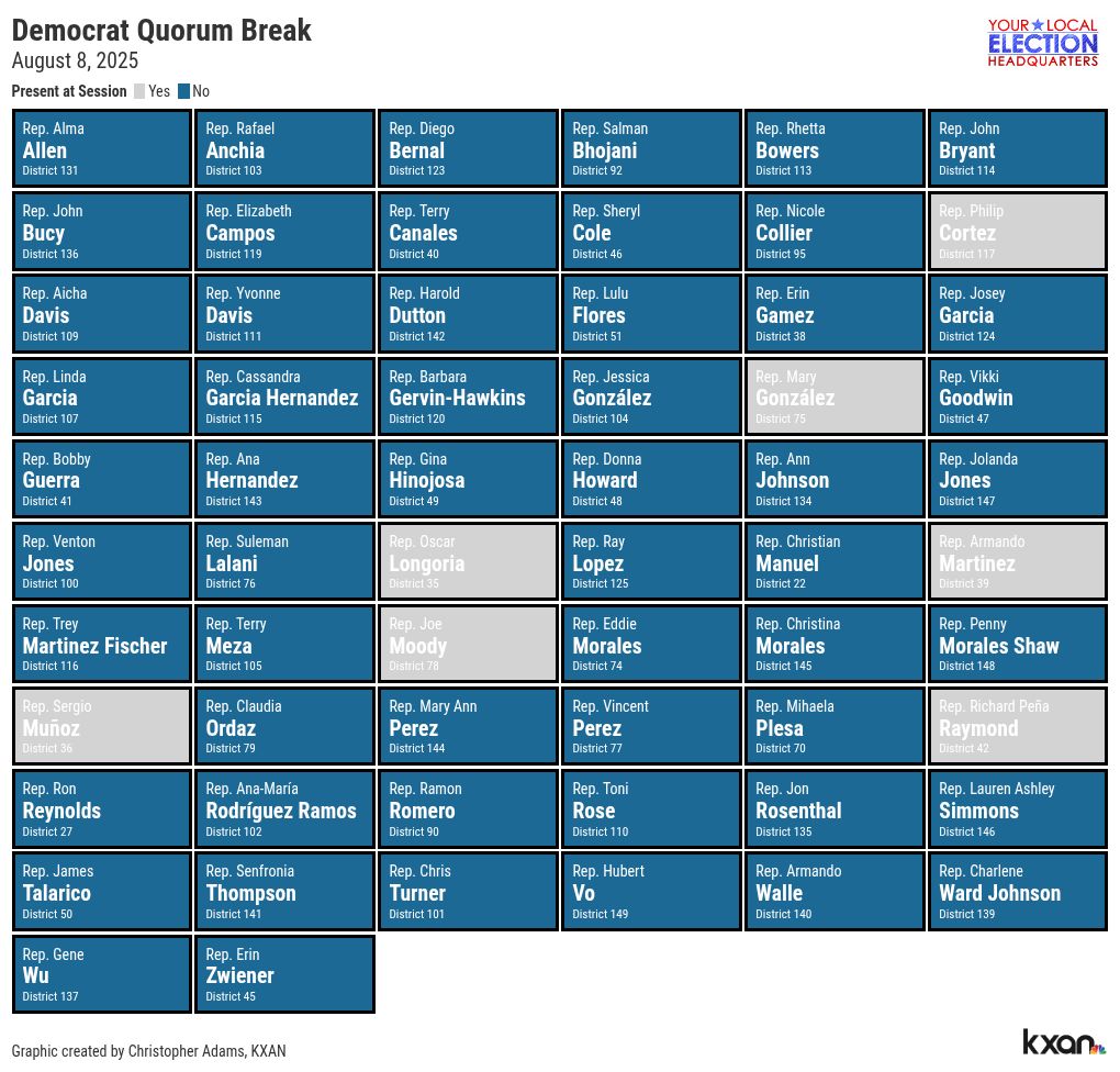 Below is a visual showing which Democrats were present at Friday’s session of the House. It will be updated shortly after Monday’s session to reflect which House Democrats were absent.