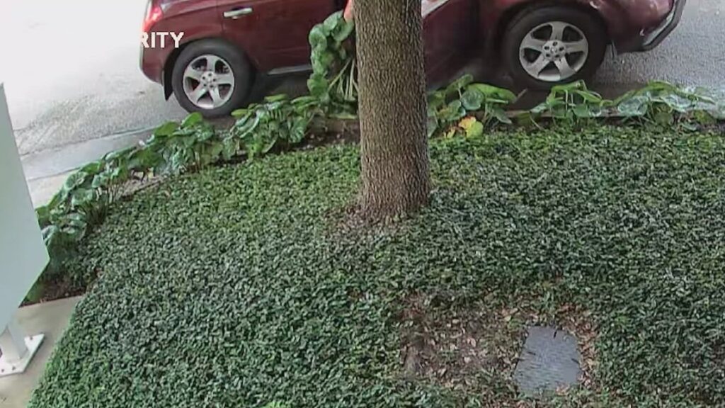The video shows a maroon-colored SUV pull up and a woman opens the passenger door, steps out and inspects the plant, and then leaves. Minutes later, she’s back. This time, she dug up the plant — roots and all.