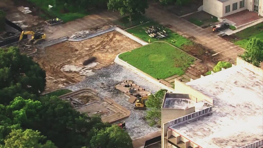 The demolition marks the first step in creating a new Centennial Plaza, part of the university’s preparations for its 100th anniversary. According to The Chron, the revamped space will feature green areas, seating, and updated water features.